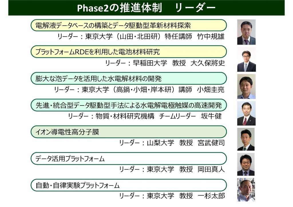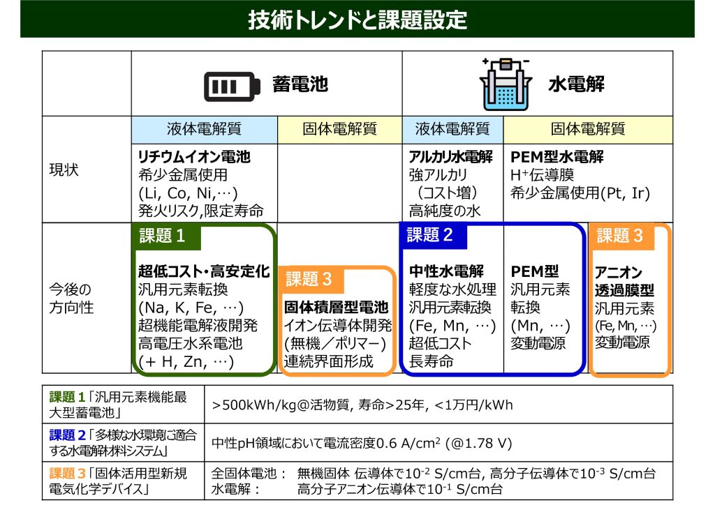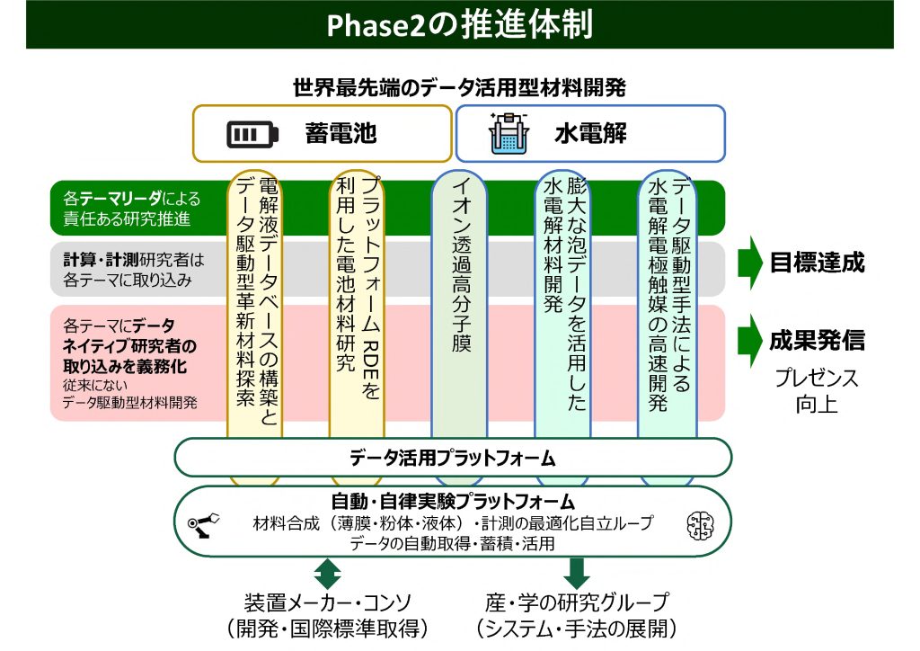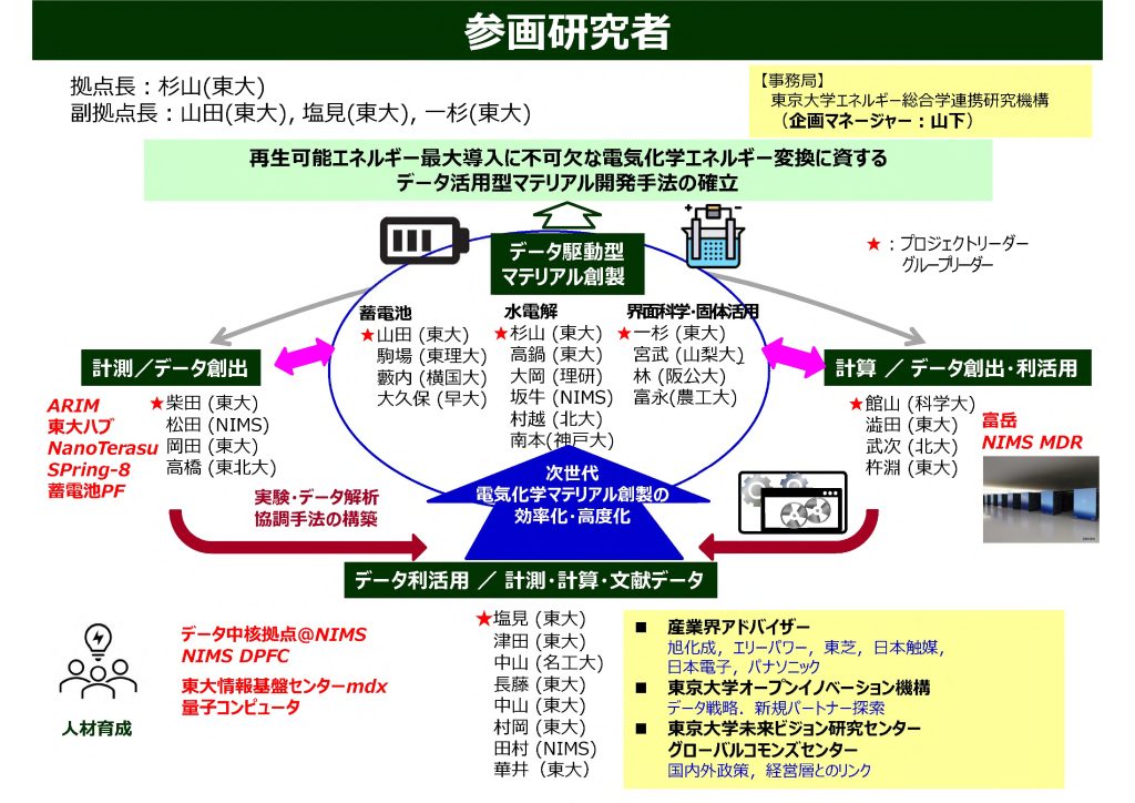 2050年にカーボンニュートラルを達成するためには、再エネ発電の大量導入と水素による化石燃料代替が必須であり、そのためには超大容量、低コストの蓄電池と水電解装置を、レアメタルを使わず安価な材料で実現することが求められます。DX-GEMでは、東大と13研究連携機関が協力し、データサイエンス的手法を取り入れたデータ駆動型の先進的な研究手法を開発し、これらの革新的材料を効率的に創出していきます。