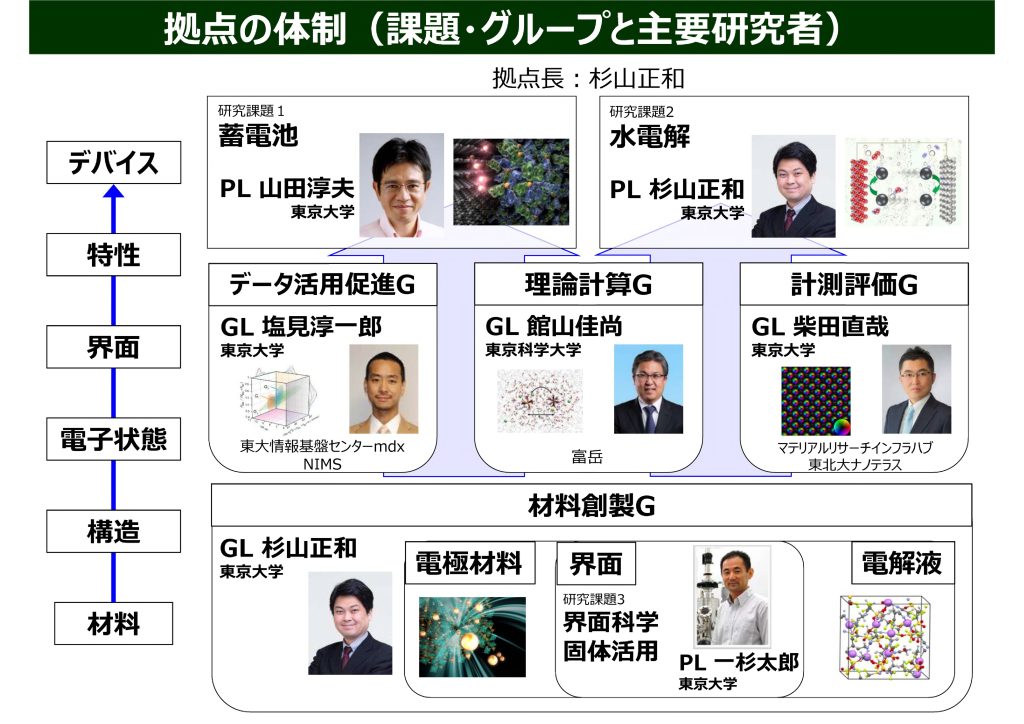 2050年にカーボンニュートラルを達成するためには、再エネ発電の大量導入と水素による化石燃料代替が必須であり、そのためには超大容量、低コストの蓄電池と水電解装置を、レアメタルを使わず安価な材料で実現することが求められます。DX-GEMでは、東大と13研究連携機関が協力し、データサイエンス的手法を取り入れたデータ駆動型の先進的な研究手法を開発し、これらの革新的材料を効率的に創出していきます。